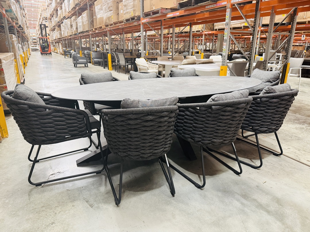 Original price was: $5,300.00.$2,699.00Current price is: $2,699.00.Designed for outdoor entertaining, this 9-piece dining setting combines a modern black and dark grey colour scheme with durable construction. It offers generous seating and a contemporary look perfect for alfresco dining areas.
