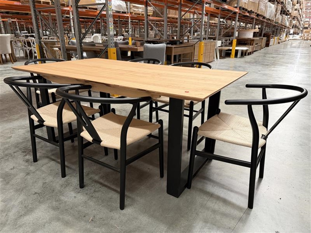 Original price was: $1,800.00.$895.00Current price is: $895.00.A timeless dining setting featuring a natural timber tabletop paired with six classic wishbone chairs. Blending natural textures with modern design, this set offers comfort, durability, and effortless style for everyday dining.