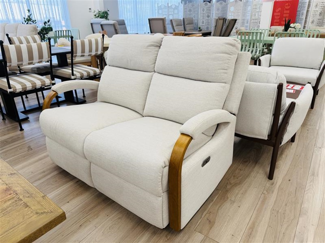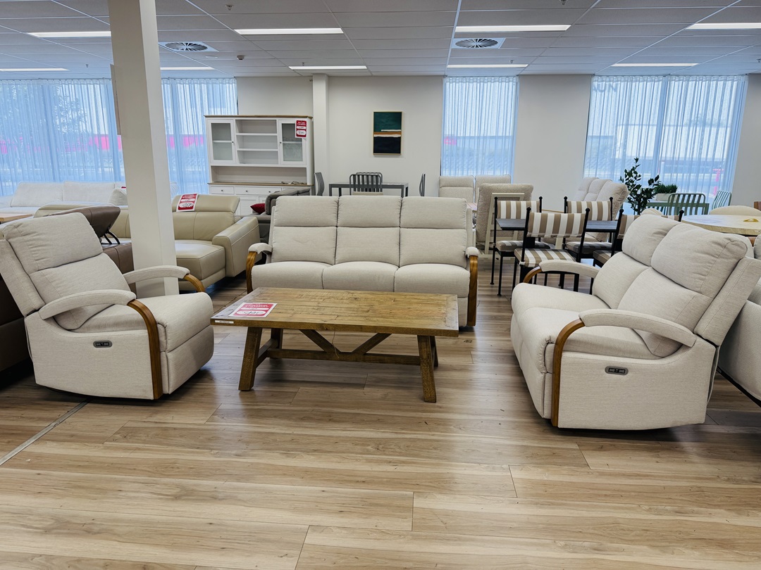 Original price was: $6,300.00.$3,199.00Current price is: $3,199.00.A stylish 3-piece recliner lounge suite upholstered in soft beige fabric with elegant timber arm detailing. Featuring smooth electric reclining for personalized comfort, this setting blends modern functionality with natural design elements.
