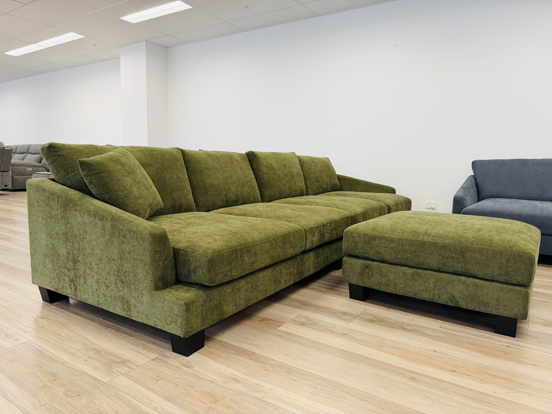 Original price was: $3,700.00.$1,895.00Current price is: $1,895.00.A contemporary 4-seater sofa in rich olive green fabric, complete with a matching ottoman. Designed for both comfort and style, it adds a bold yet elegant touch to your living room.
