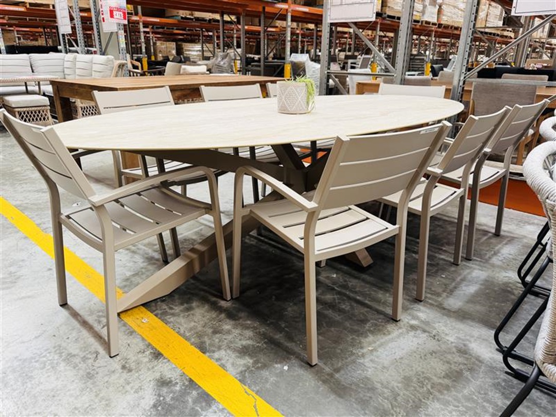 Original price was: $4,700.00.$2,395.00Current price is: $2,395.00.A contemporary outdoor dining setting featuring a large table and eight matching chairs in a stylish taupe finish. Built for durability and comfort, it’s ideal for outdoor entertaining and family gatherings.