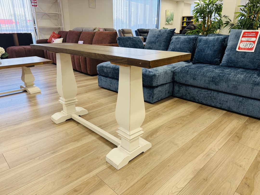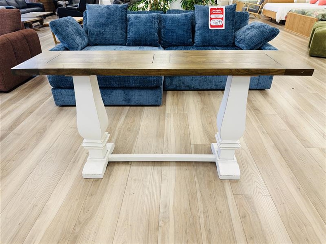 Original price was: $490.00.$249.00Current price is: $249.00.A sleek hall table featuring a walnut timber top supported by elegant white pedestal legs. Perfect for entryways or hallways, offering a modern and functional design.