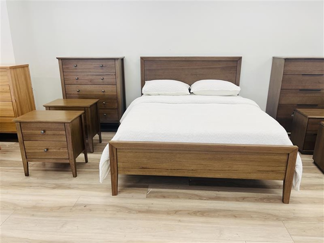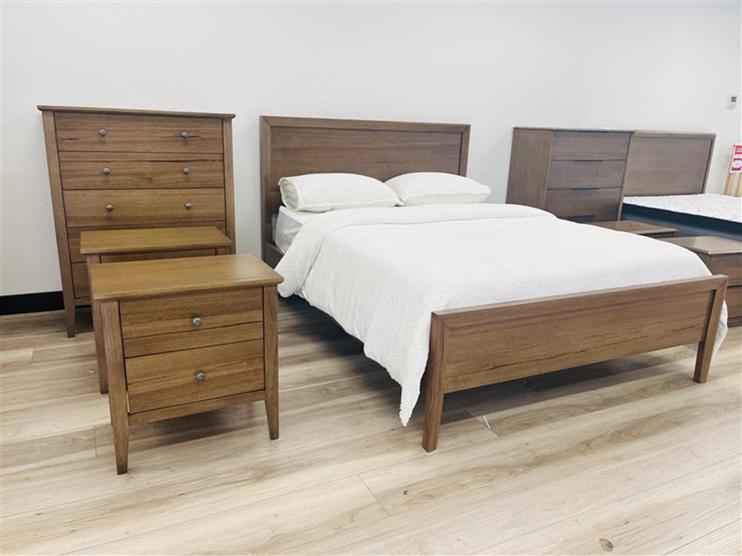 Original price was: $5,000.00.$2,595.00Current price is: $2,595.00.A contemporary 4-piece suite featuring a queen bed, tallboy, and matching bedsides. The natural timber finish highlights the beauty of the wood grain, making it perfect for modern and rustic interiors alike.