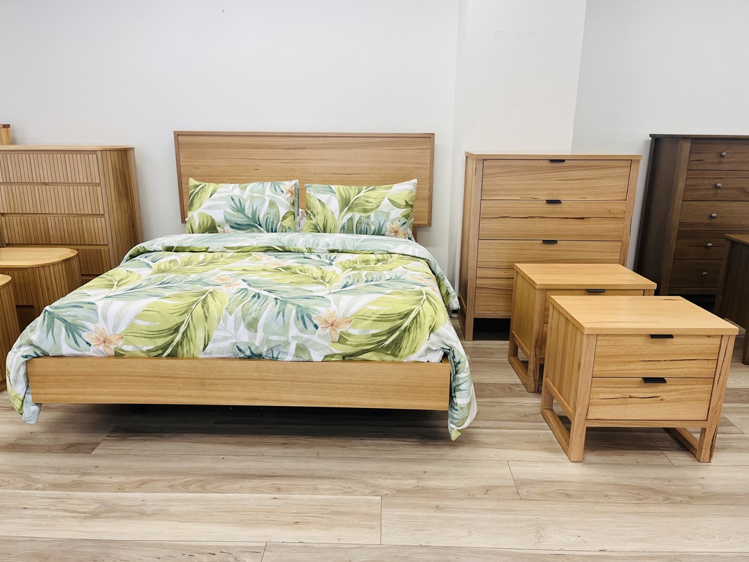 Original price was: $3,500.00.$1,995.00Current price is: $1,995.00.Constructed from genuine Messmate timber, this suite showcases unique natural variations and textures. It includes a queen bed, tallboy, and bedside tables — blending craftsmanship with timeless design.