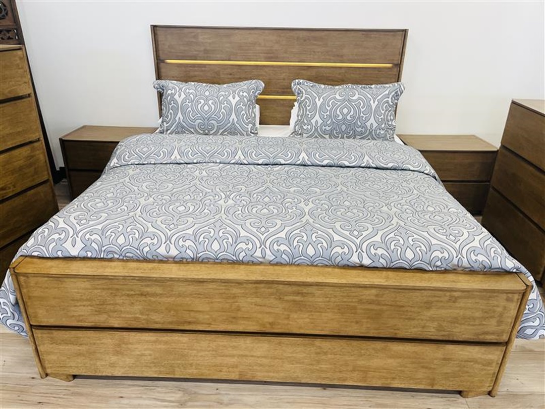 Crafted from premium golden oak timber, this elegant 5-piece suite includes a king bed with integrated LED lights, matching bedsides, tallboy, and dresser. The natural oak finish adds warmth and sophistication to any bedroom