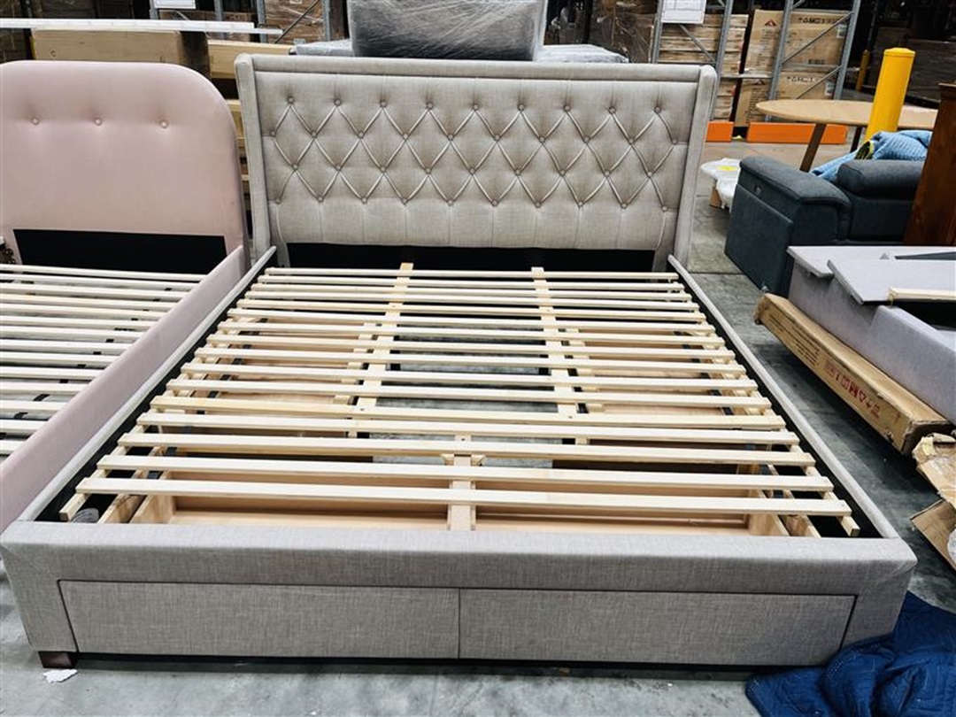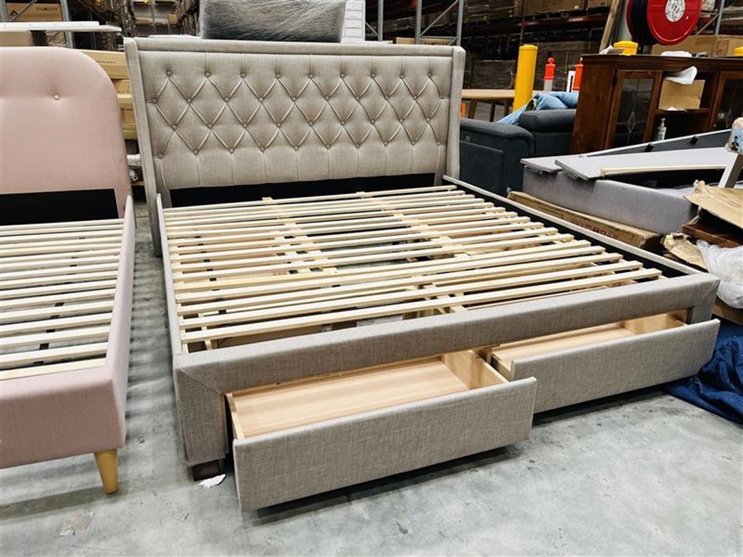This elegant king bed is upholstered in soft light grey fabric, offering a modern and calming aesthetic. Featuring four spacious drawers, it provides smart hidden storage for your bedroom essentials. A perfect blend of comfort, luxury & practicality.