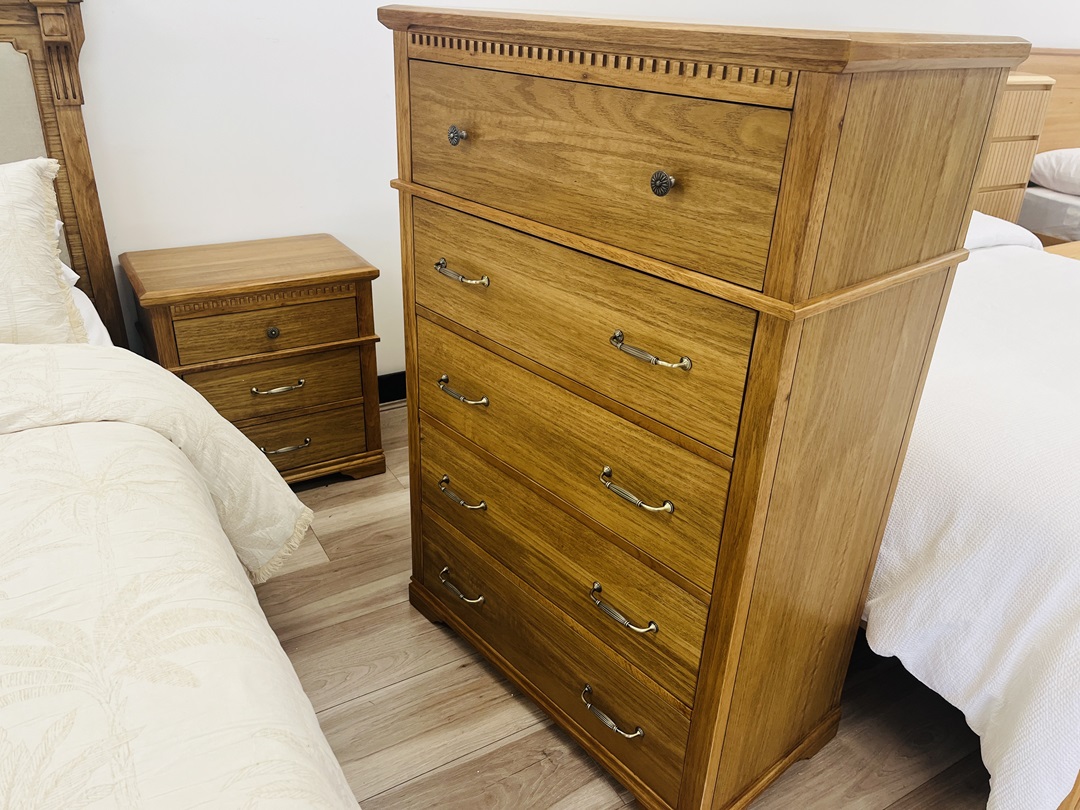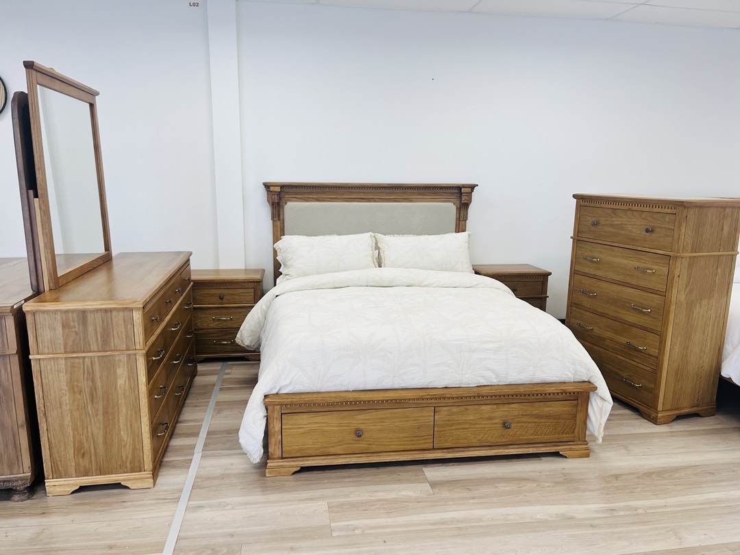 Made from solid mountain ash timber, this suite includes a queen bed with under-bed storage drawers, offering both practicality and charm. It’s completed with stylish matching bedsides and tallboy for a cohesive look.