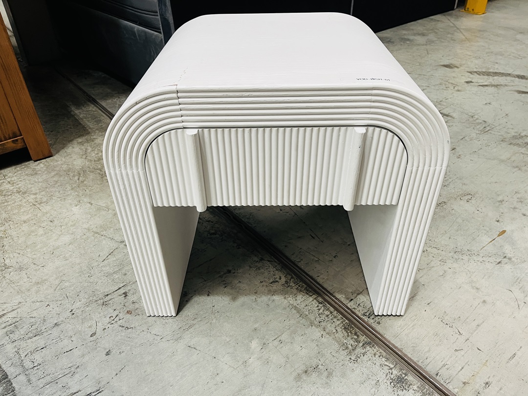 Beautifully crafted from white timber, this bedside table features a unique curved design for a contemporary touch. It includes one smooth-gliding drawer for convenient storage. A stylish companion to any modern or classic bed setting.
