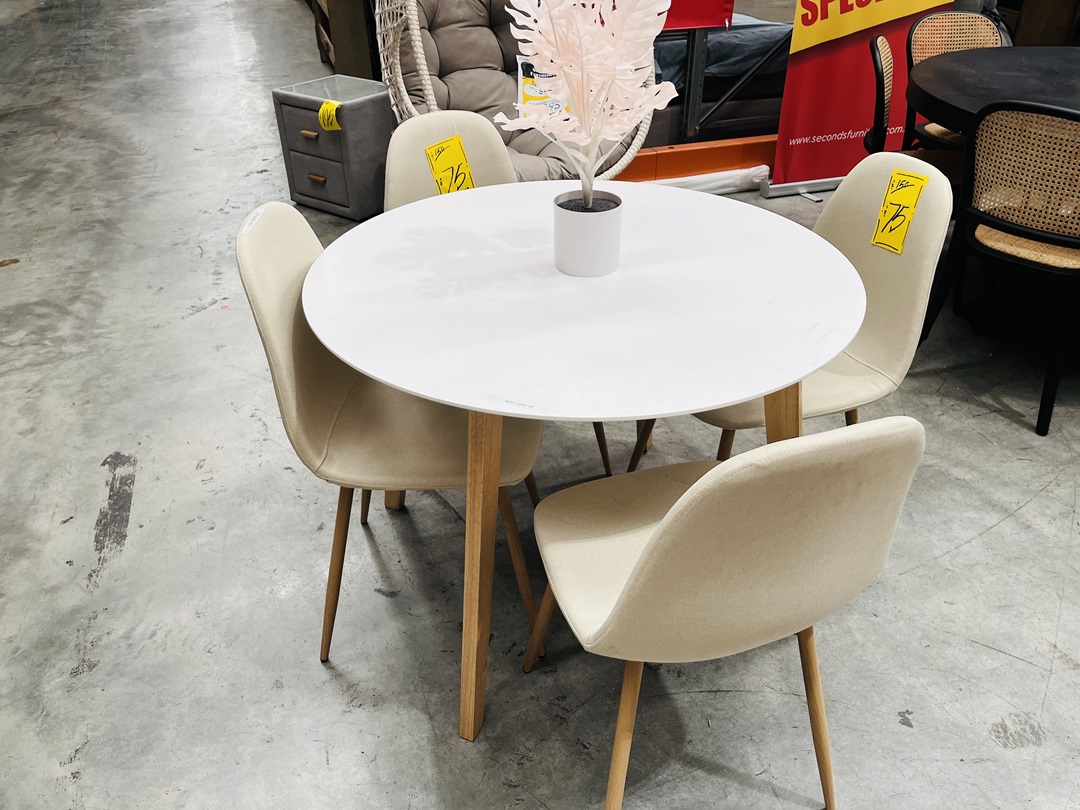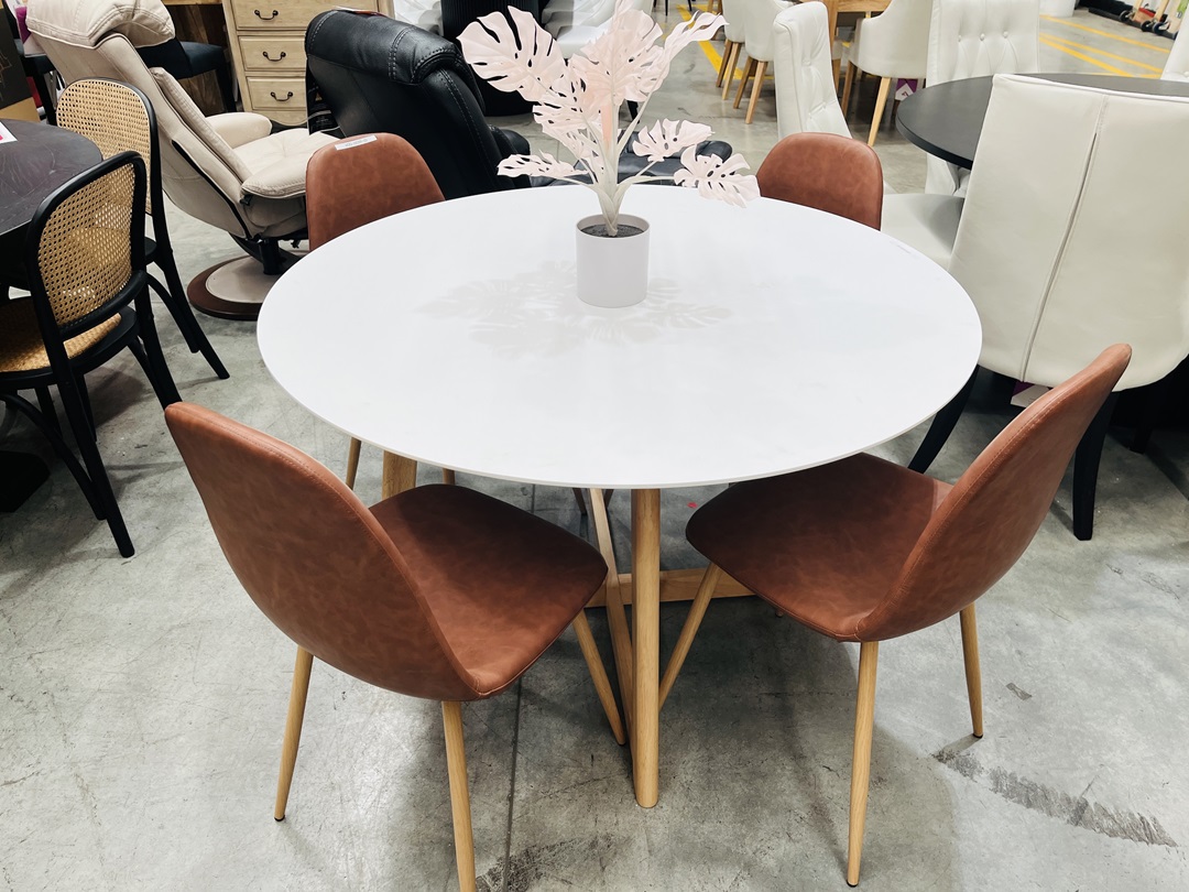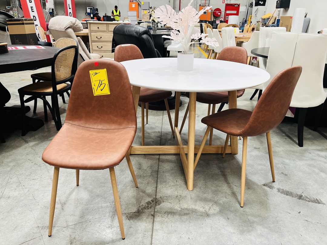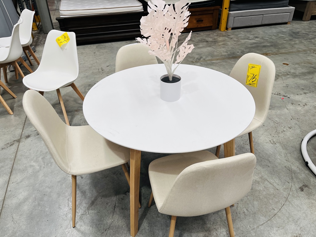 This stylish 5-piece dining set includes a round table paired with four tan upholstered chairs. The warm tones and soft seating create a cozy, inviting dining atmosphere. Perfect for family meals or casual entertaining in any modern home.