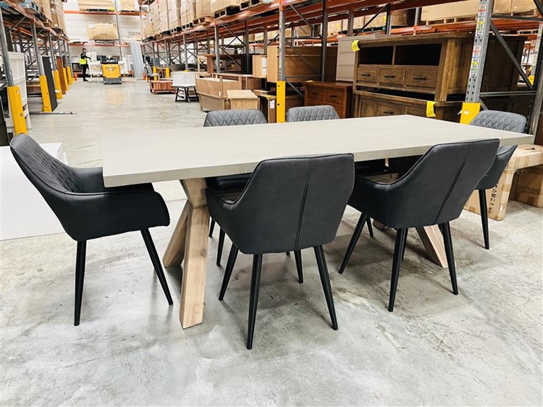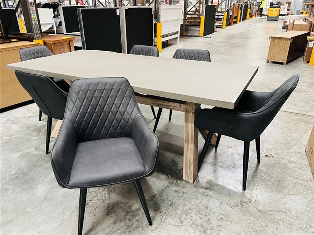 A bold and modern dining set featuring a solid grey concrete top table paired with six matching fabric chairs. The sturdy design and soft seating ensure both comfort and durability. Perfect for stylish family meals and entertaining guests.