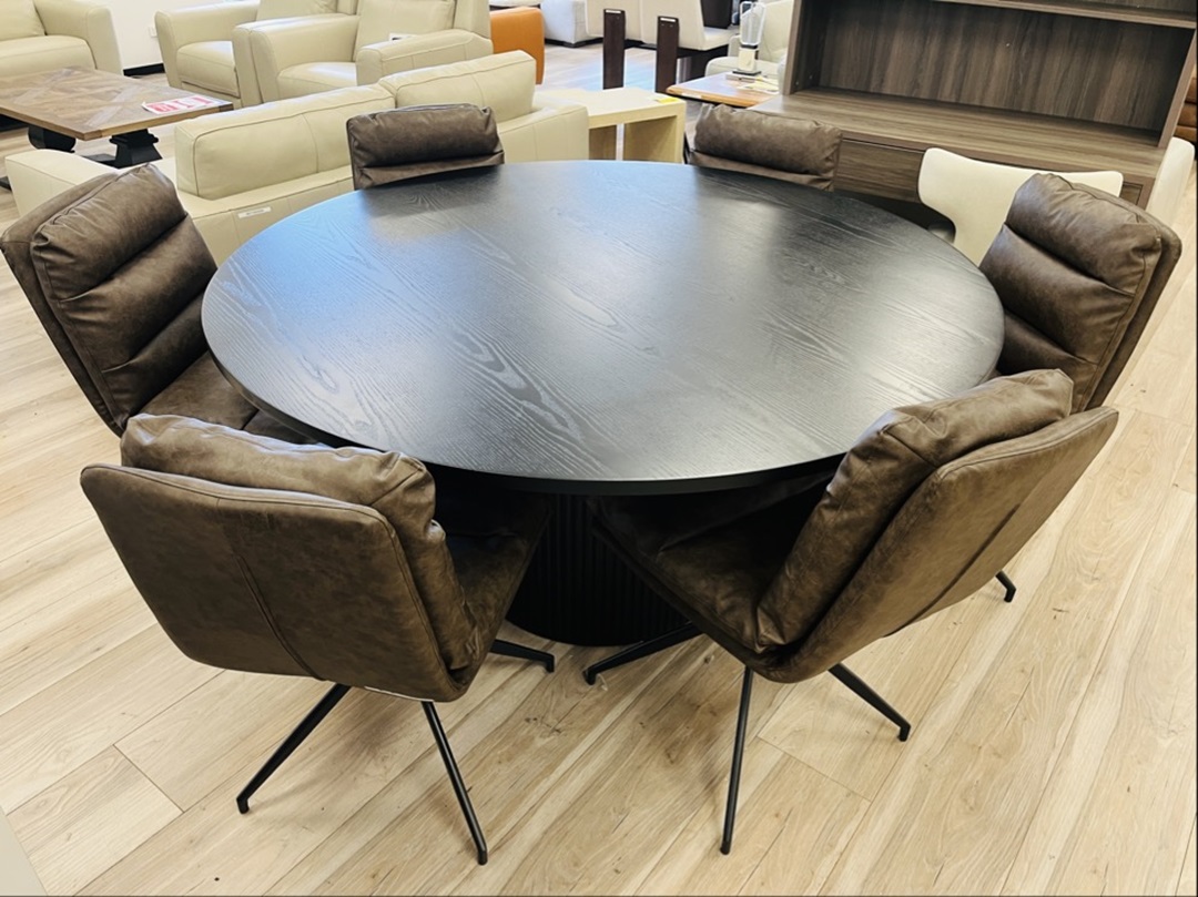 This stunning 7-piece set features a bold 1.5m black timber round table and six brown leather chairs. A perfect mix of elegance and durability, ideal for modern dining areas.