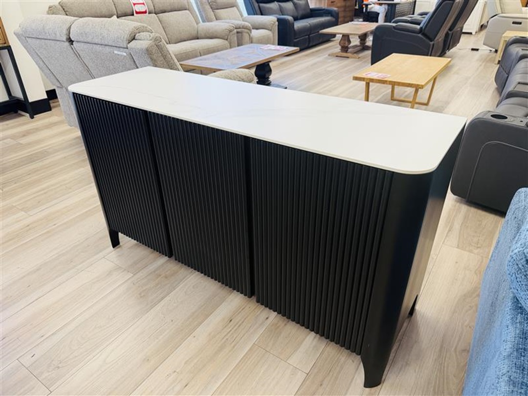 A contemporary buffet unit in a striking black and white finish. Measuring 150cm, it features three doors with ample internal storage, perfect for organizing dining or living essentials.