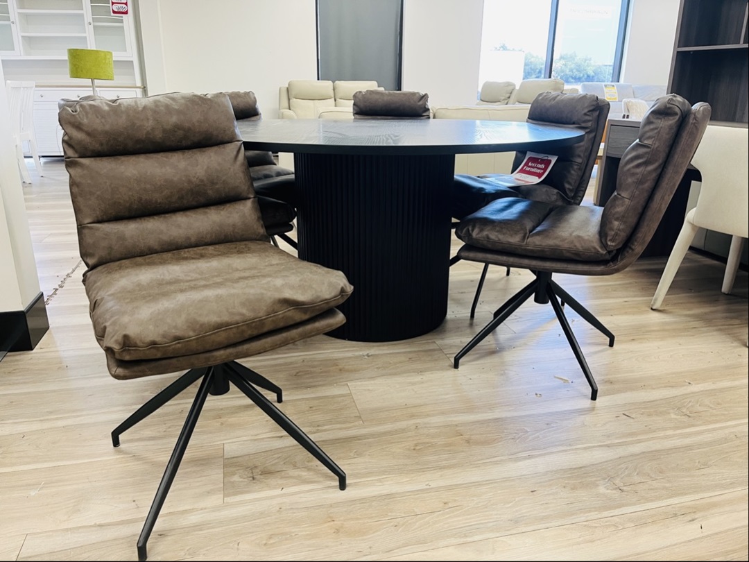 This stunning 7-piece set features a bold 1.5m black timber round table and six brown leather chairs. A perfect mix of elegance and durability, ideal for modern dining areas.