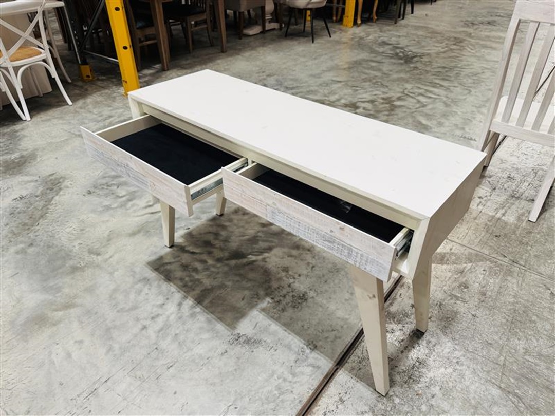 This 120cm hall table showcases a crisp white timber finish that brightens entryways and living spaces. With two practical drawers and a generous tabletop surface, it is perfect for displaying décor while keeping everyday items neatly organised.