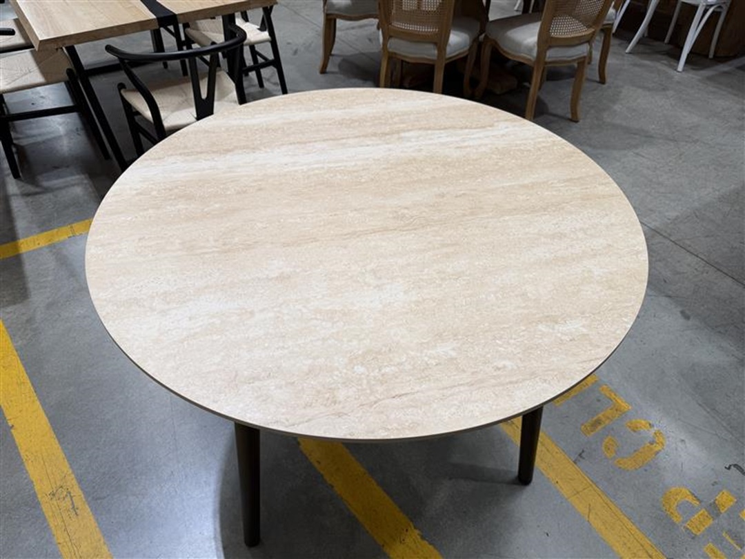 The 120cm Round Dining Table with Walnut Legs & Stone Top combines a premium stone tabletop with elegant walnut timber legs, creating a stylish and durable centrepiece ideal for modern dining spaces.