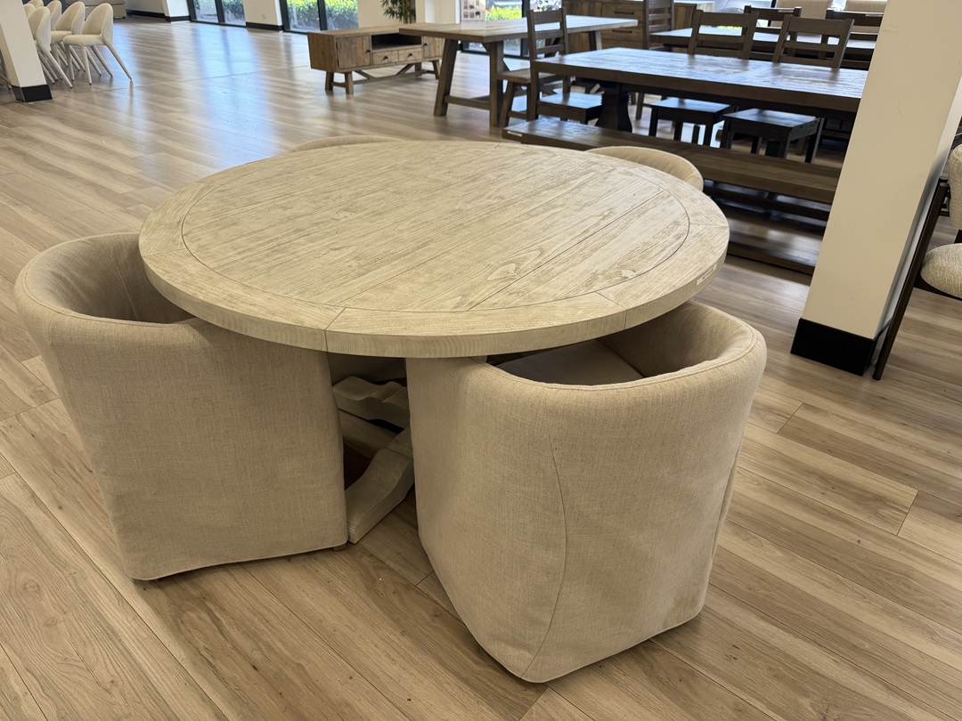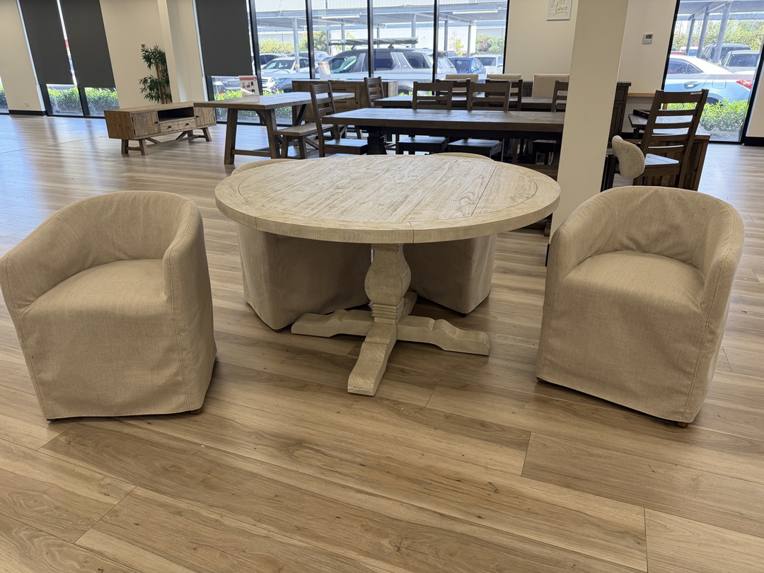 A stylish 140 cm round dining table finished in a soft greywash tone, paired with four comfortable beige tub chairs. Perfect for modern dining spaces, offering comfort and a contemporary aesthetic.