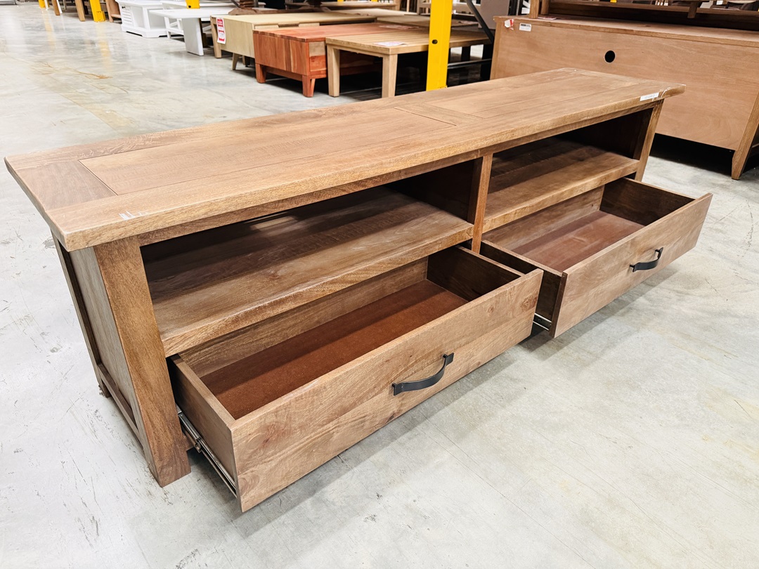A stylish TV unit finished in rich walnut timber with two drawers and two open shelves. Provides practical storage for media devices and accessories. Designed with a clean and modern look. A perfect addition to any living room setup.