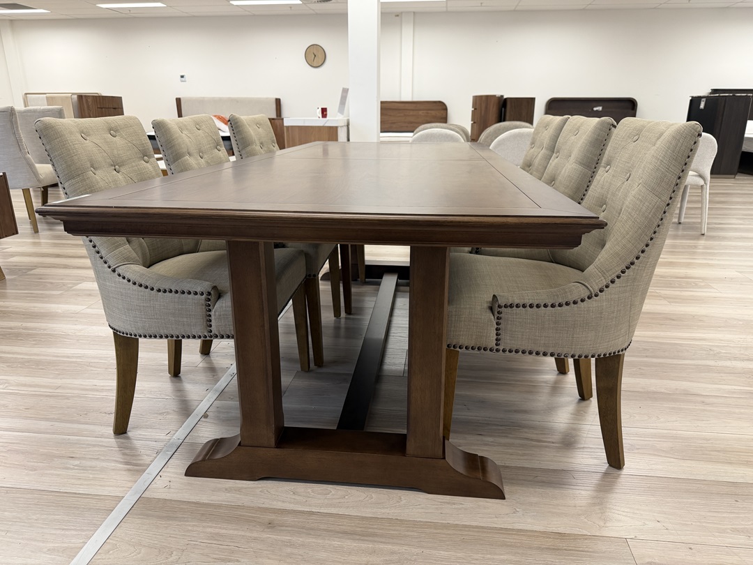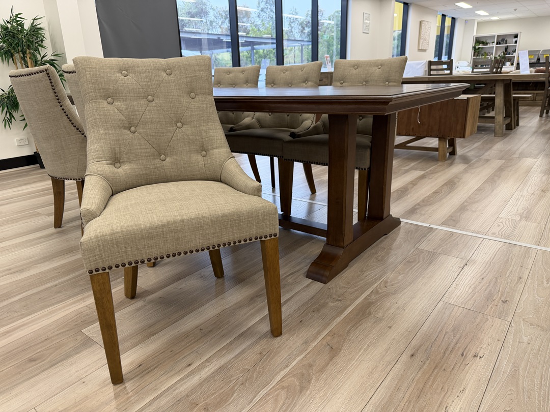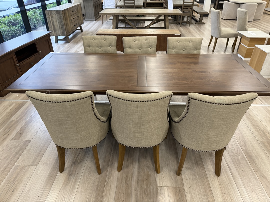 A spacious 7-piece dining set featuring a 210cm mocca timber table paired with six soft beige fabric chairs. Combines comfort, durability, and timeless style. Ideal for family meals or large gatherings.