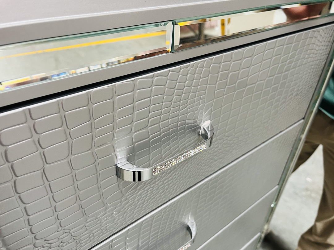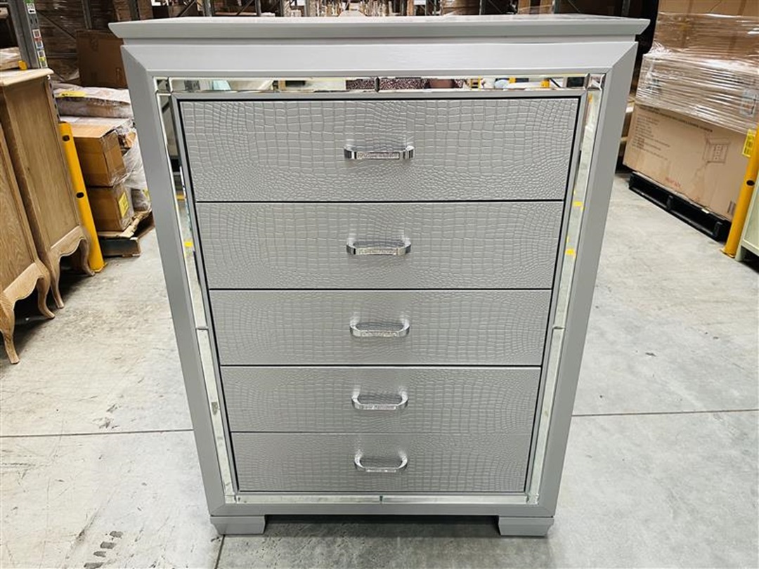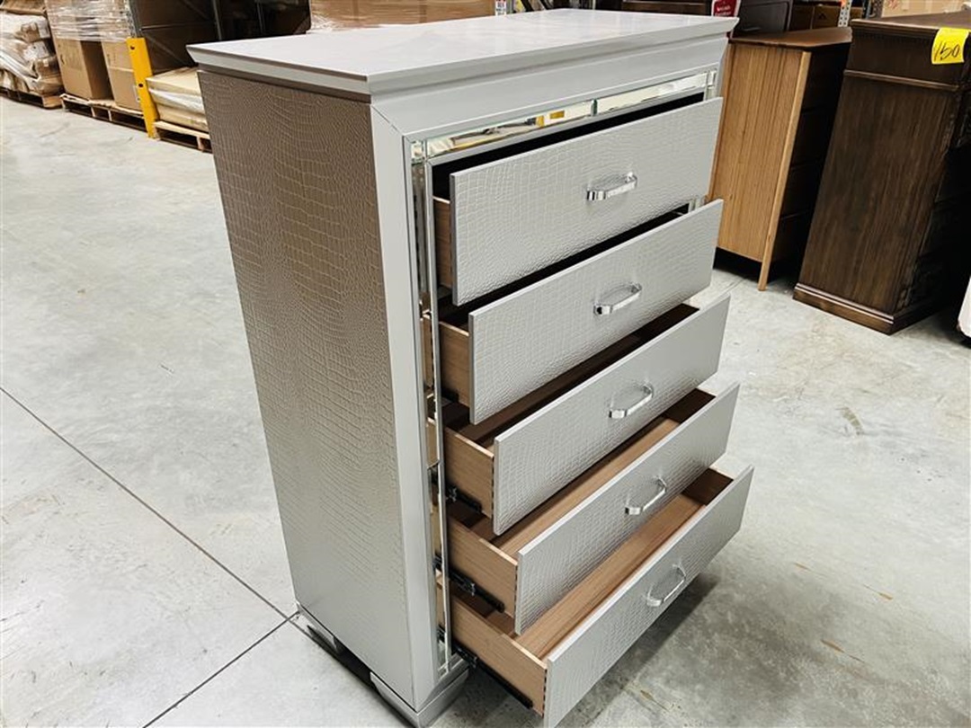 This spacious tallboy features five smooth-gliding drawers, perfect for organizing clothes and accessories. Finished in a sleek silver tone, it adds a touch of modern elegance to your bedroom.