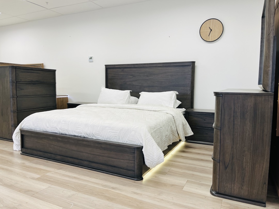 A bold and modern suite, this 4-piece set includes a queen bed frame, two matching bedsides, and a coordinating dresser. The sleek black timber brings contemporary sophistication and pairs well with light linens and metallic accents.