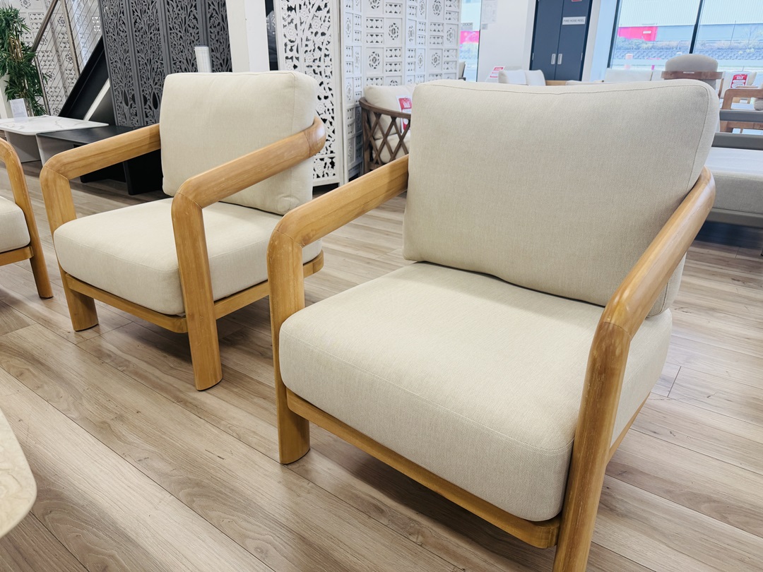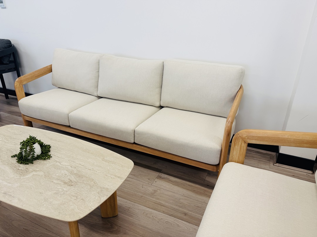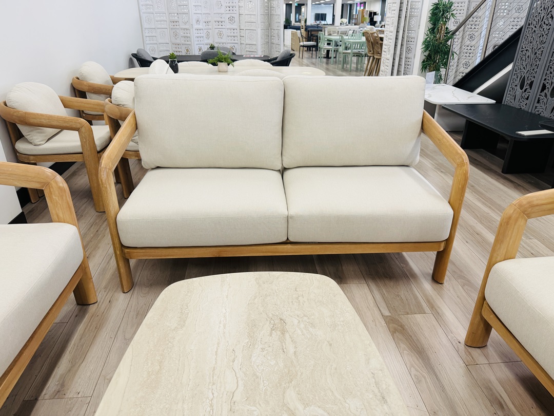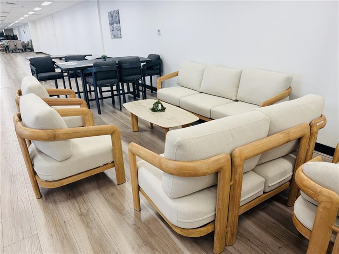 The 5pc Natural Timber Outdoor Sofa Set with Beige Cushions blends sturdy timber frames with soft beige cushions, delivering a warm and comfortable outdoor lounging solution.