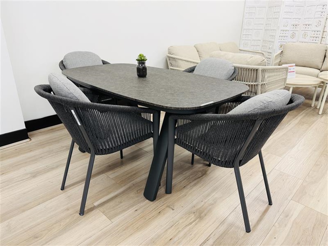 A sleek and modern dark grey outdoor armchair designed for comfort and durability. Its sturdy construction and weather-resistant materials make it ideal for any patio or garden, providing a stylish seating option with its clean lines and contemporary design.