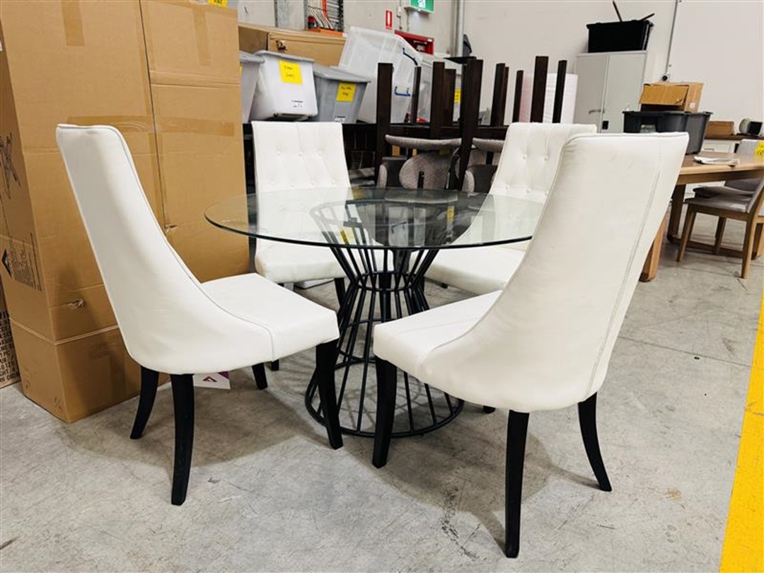 The 5pc Round Dining Set with Glass Table & White Leather Chairs combines a sleek glass tabletop with comfortable white leather chairs, creating a bright and elegant dining setting ideal for everyday use or entertaining.