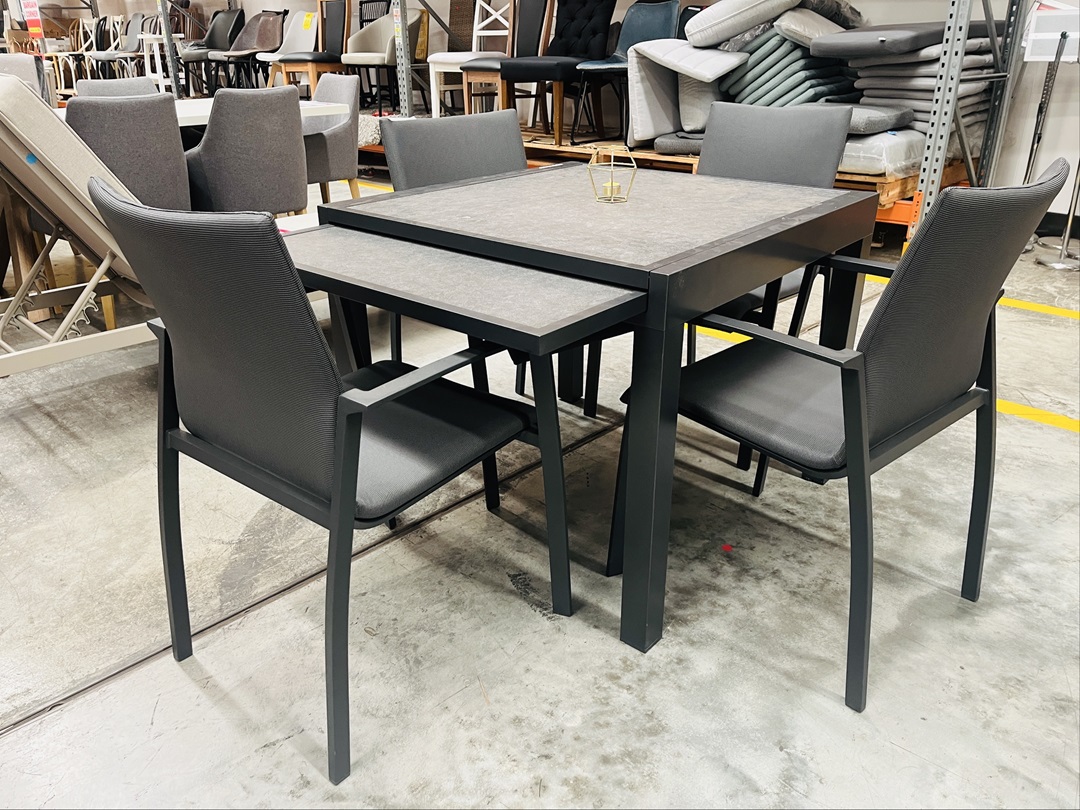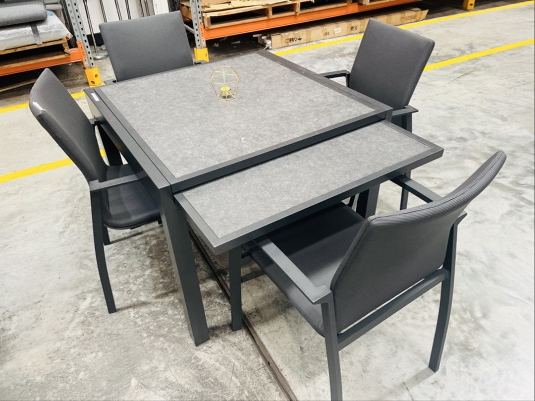 A versatile 5-piece outdoor set featuring a square dark grey extension table and four matching chairs. Built with weather-resistant materials for long-lasting outdoor enjoyment.