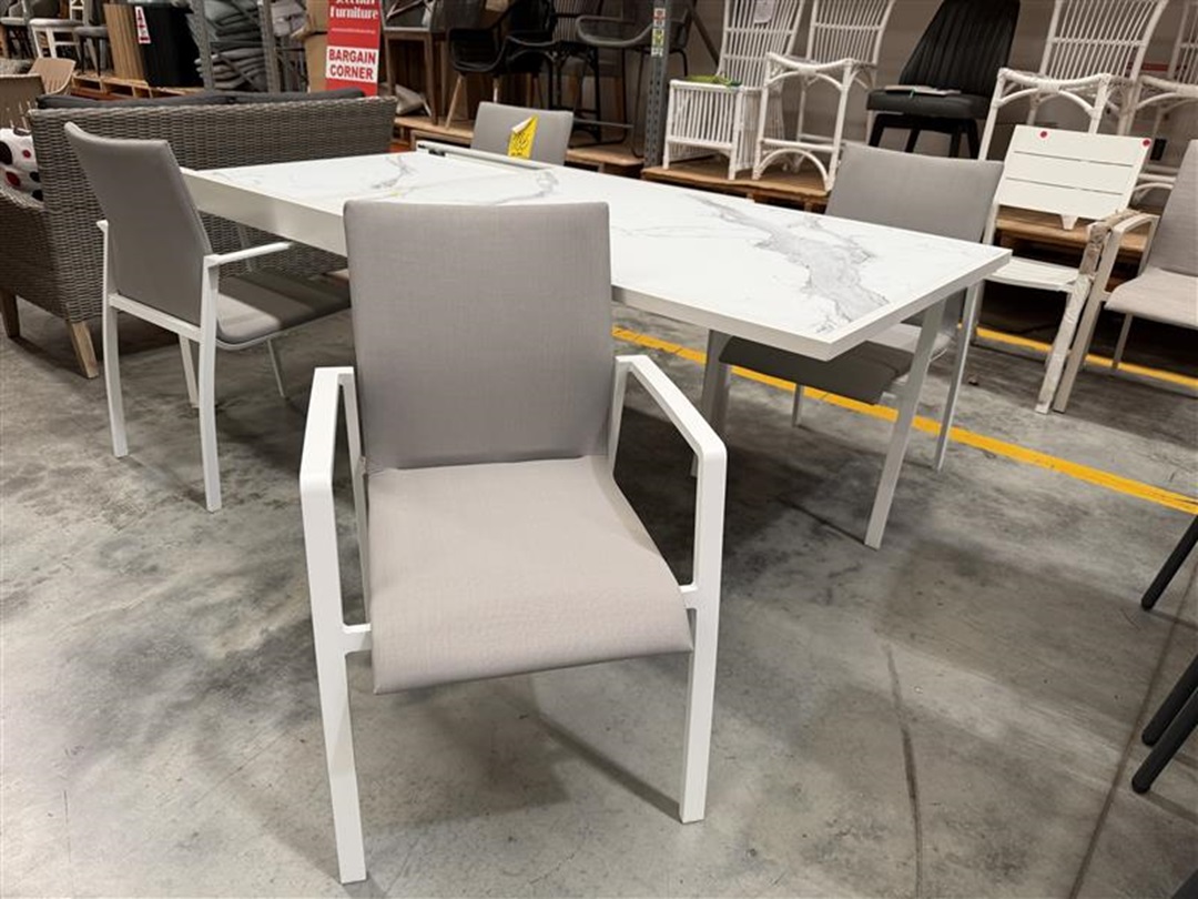 A fresh and modern 5-piece outdoor dining set in a clean white finish that includes an extendable table and matching chairs ideal for flexible outdoor entertaining.