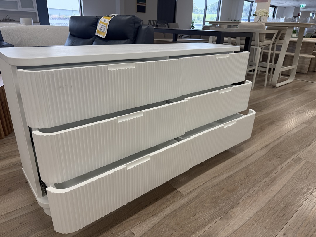 This beautifully designed dresser features a smooth curved profile with a crisp white finish, adding a soft and elegant touch to any bedroom. With six spacious drawers, it offers ample storage for clothing and essentials while maintaining a clean, contemporary look.