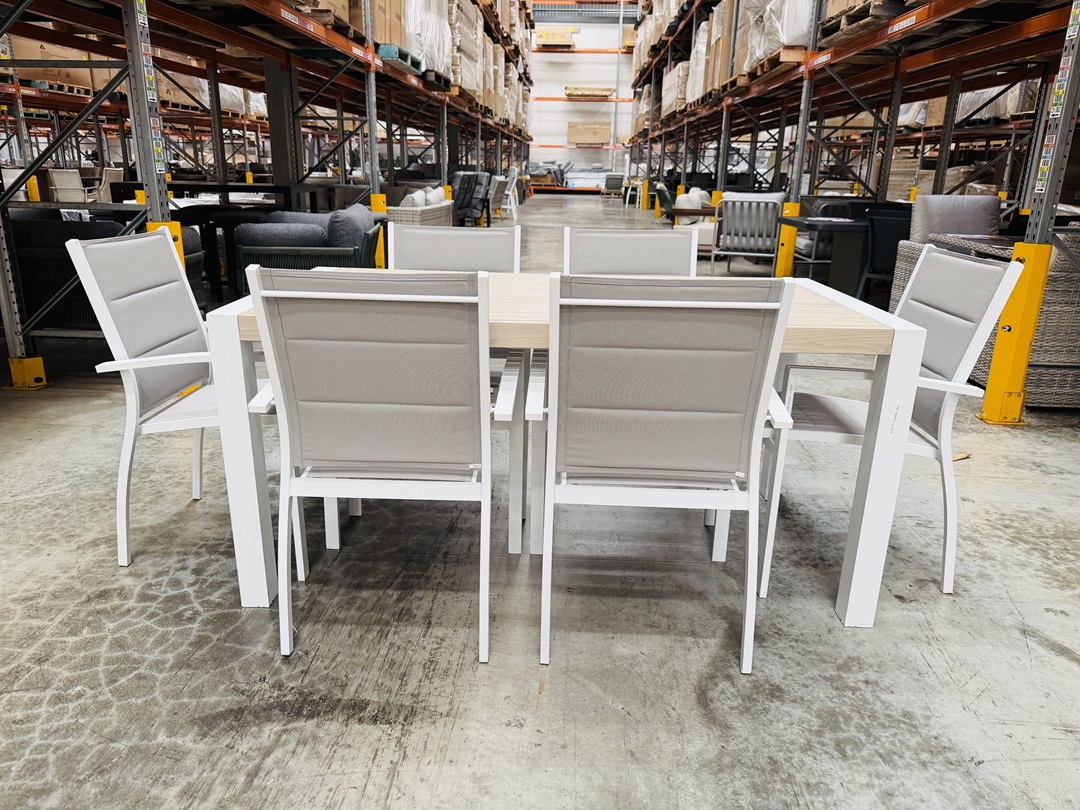 A modern outdoor dining set crafted with a lightweight yet durable aluminium frame. This 7-piece setting includes a table and six matching chairs, perfect for patios, decks, or garden dining.
