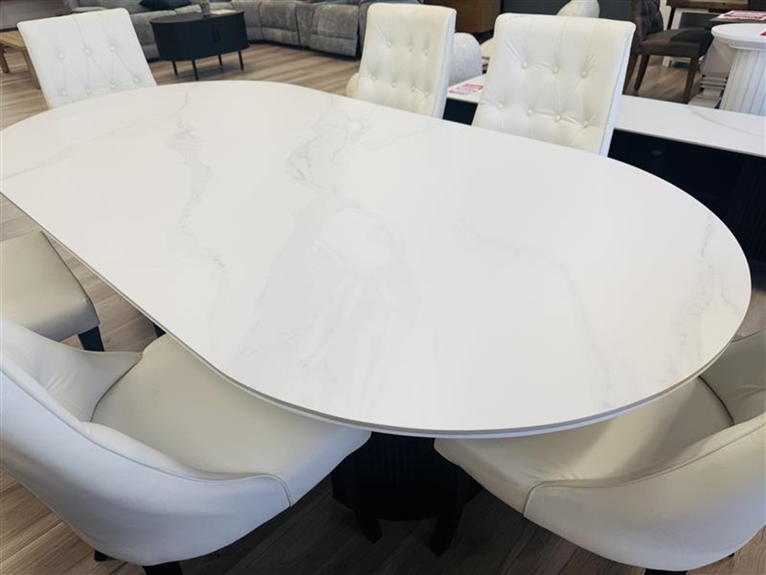 A stylish dining set featuring a modern black and white oval table with six matching chairs. Designed for comfort and everyday use. Perfect for family meals and entertaining guests.