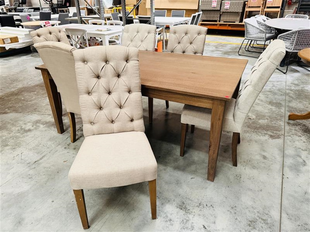 A beautifully coordinated dining set featuring a sturdy timber table paired with six comfortable beige fabric chairs. Designed for everyday dining and entertaining, it combines natural warmth with modern comfort.