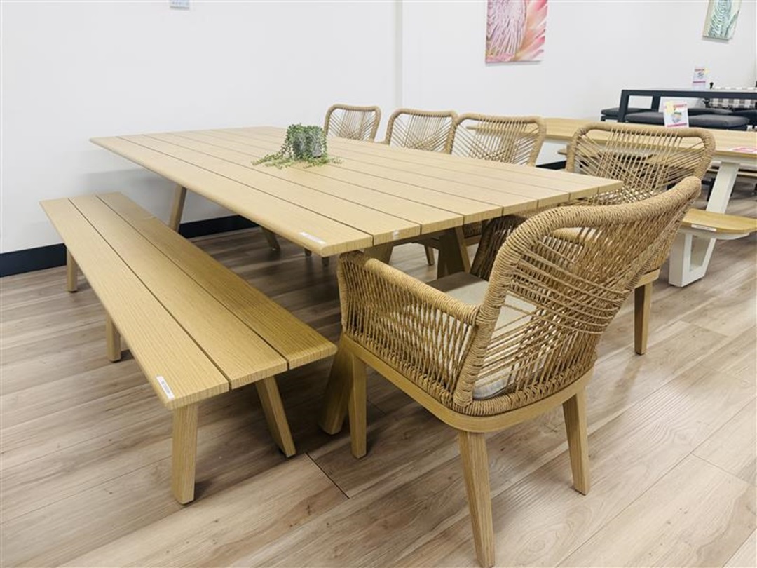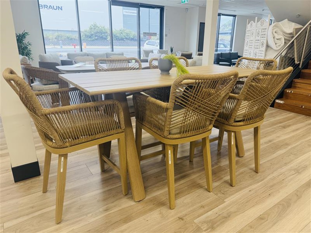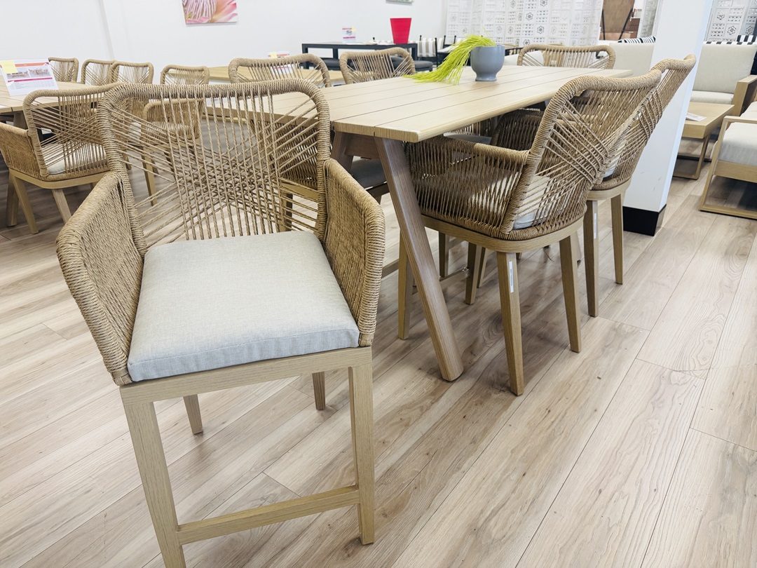 The 7pc Natural Outdoor Bar Setting combines contemporary bar-style dining with durable outdoor construction, making it perfect for casual entertaining. Its natural colour palette enhances modern outdoor spaces.