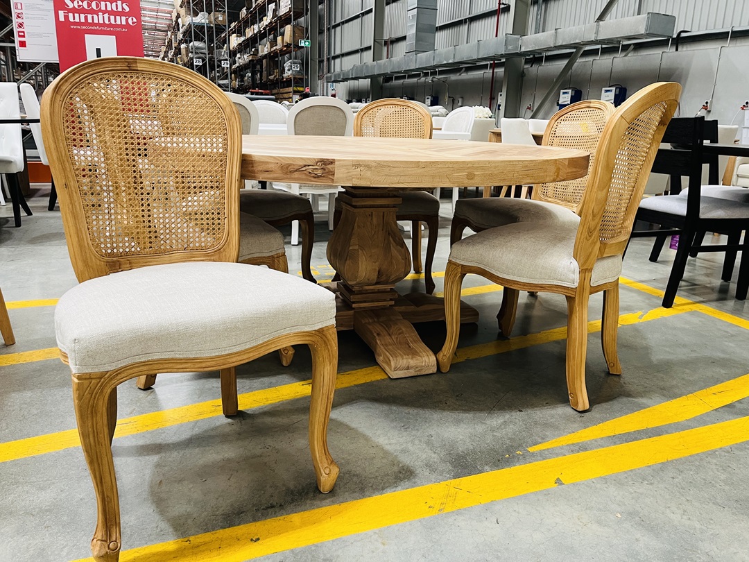 A beautiful natural timber round table complemented by six rattan-back chairs. Combines rustic texture with timeless charm — perfect for casual or formal dining spaces.