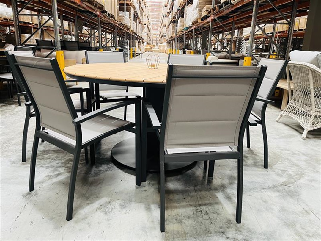 Stylish and durable 7-piece outdoor dining set featuring a round table and six grey chairs. Designed for outdoor comfort and weather resistance. Perfect for patios, decks, or garden entertaining.