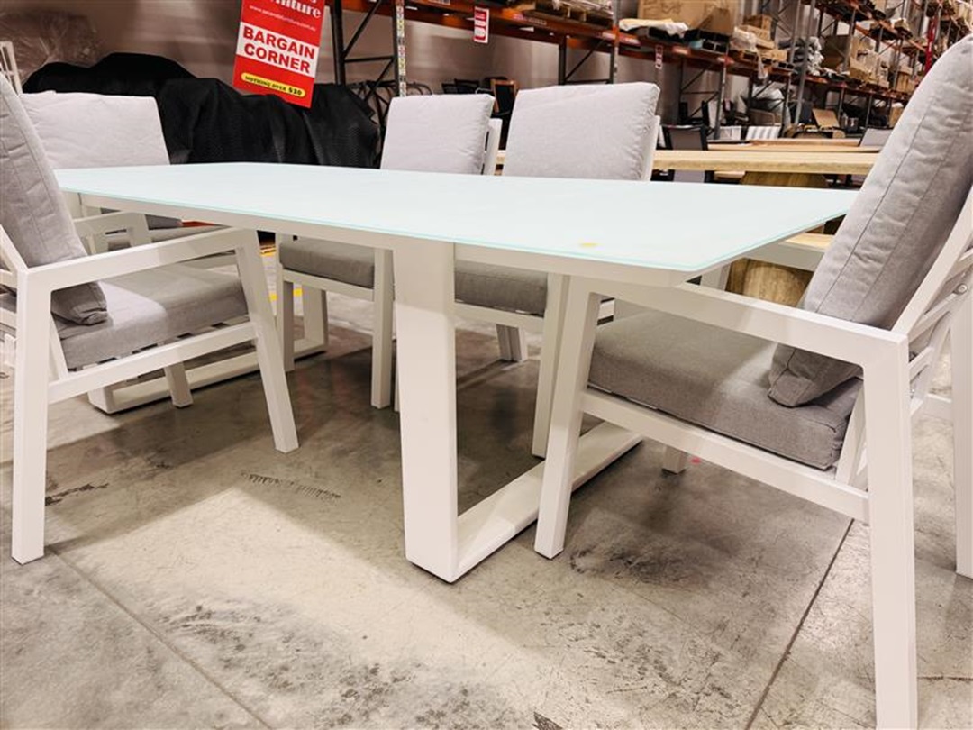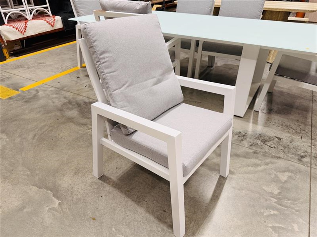 A contemporary outdoor dining set featuring a white frame glass-top table and six cushioned chairs for added comfort. Designed for outdoor entertaining with a clean, elegant look.