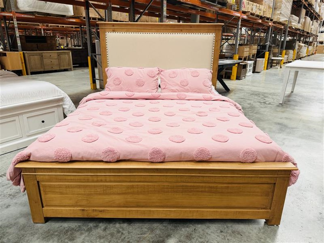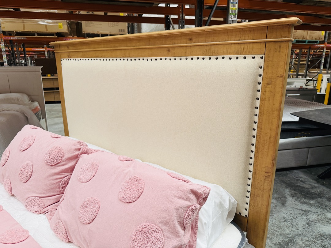 A timeless queen bed crafted in an antique natural timber finish, featuring a soft upholstered fabric headboard for added comfort and elegance. Perfect for creating a warm and inviting bedroom atmosphere.