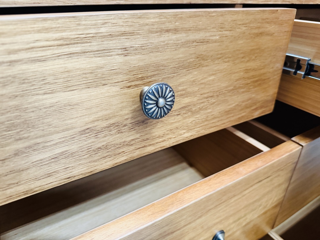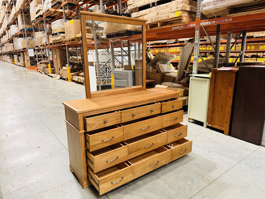 Made from richly toned antique teak timber, this dresser highlights beautiful natural grain patterns and classic craftsmanship. With twelve generously sized drawers and a matching framed mirror, it offers exceptional storage and creates a striking centrepiece for traditional or heritage-inspired bedrooms.