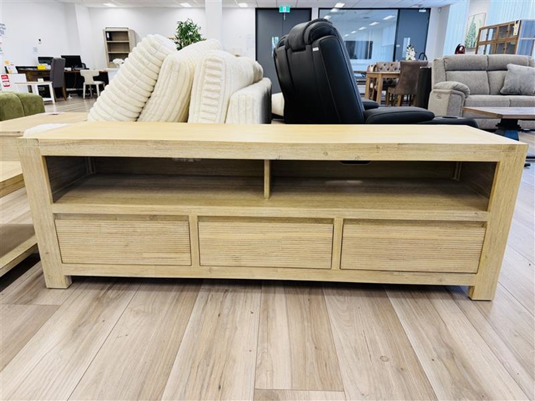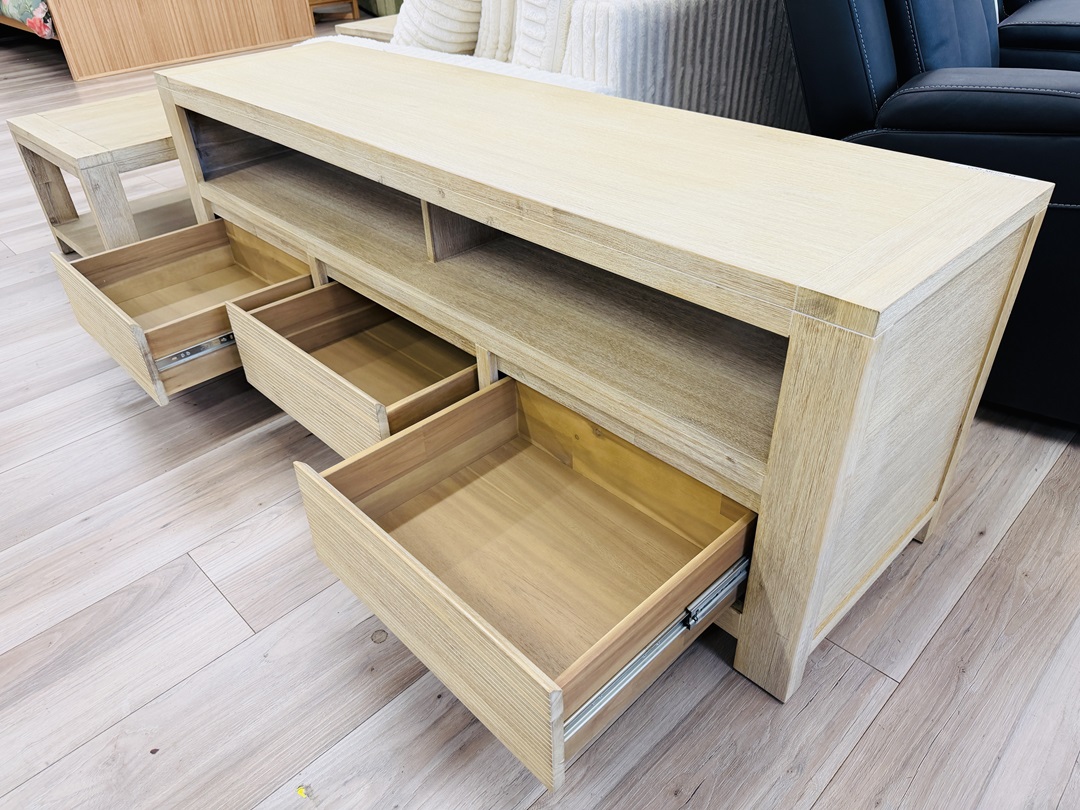 A contemporary TV unit crafted from ash timber, featuring three drawers and two open niches for media storage. Combines functionality with a clean and modern design for your living area.