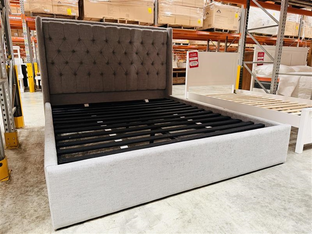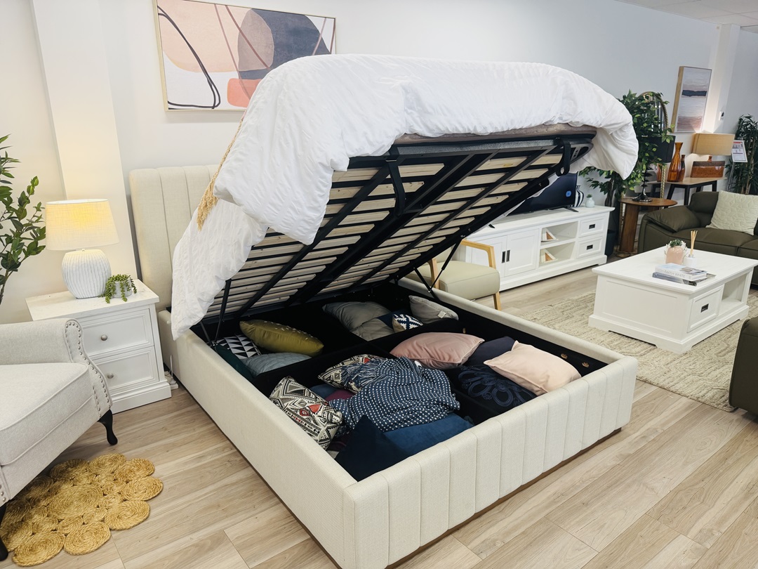 A practical and stylish queen bed finished in soft beige fabric. The gas-lift base reveals spacious hidden storage, making it perfect for keeping bedding and essentials neatly organized.