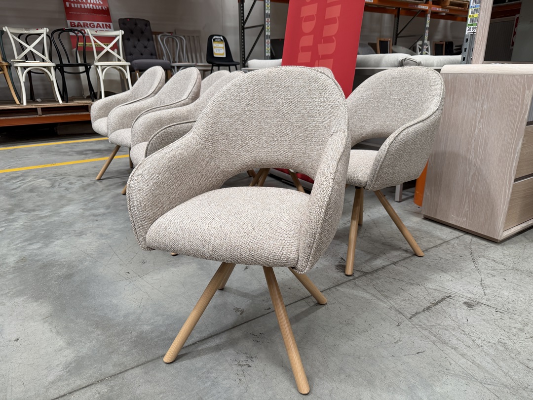 A versatile swivel dining chair covered in premium beige fabric. Features smooth 360° rotation for easy movement and comfort during meals or meetings.