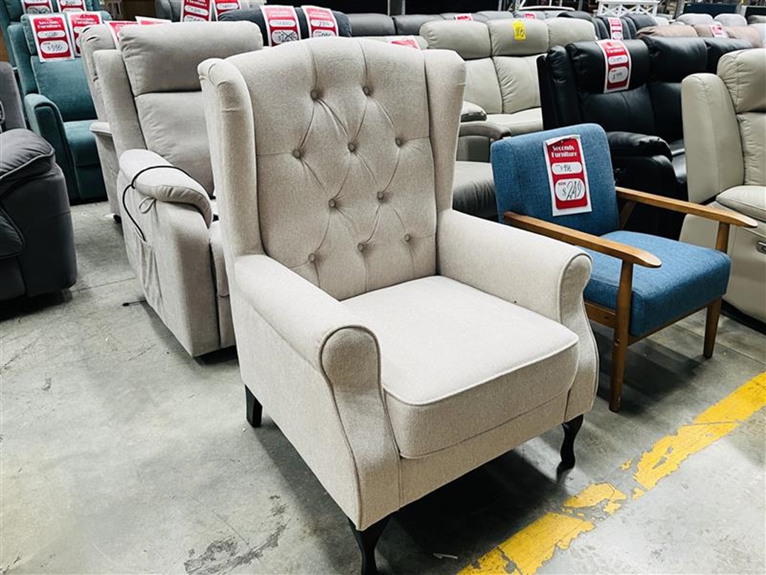 Upholstered in soft beige fabric, this wing back armchair offers timeless elegance and cozy comfort. The high back and curved arms provide excellent support. Ideal for reading corners, lounges, or sophisticated living spaces.