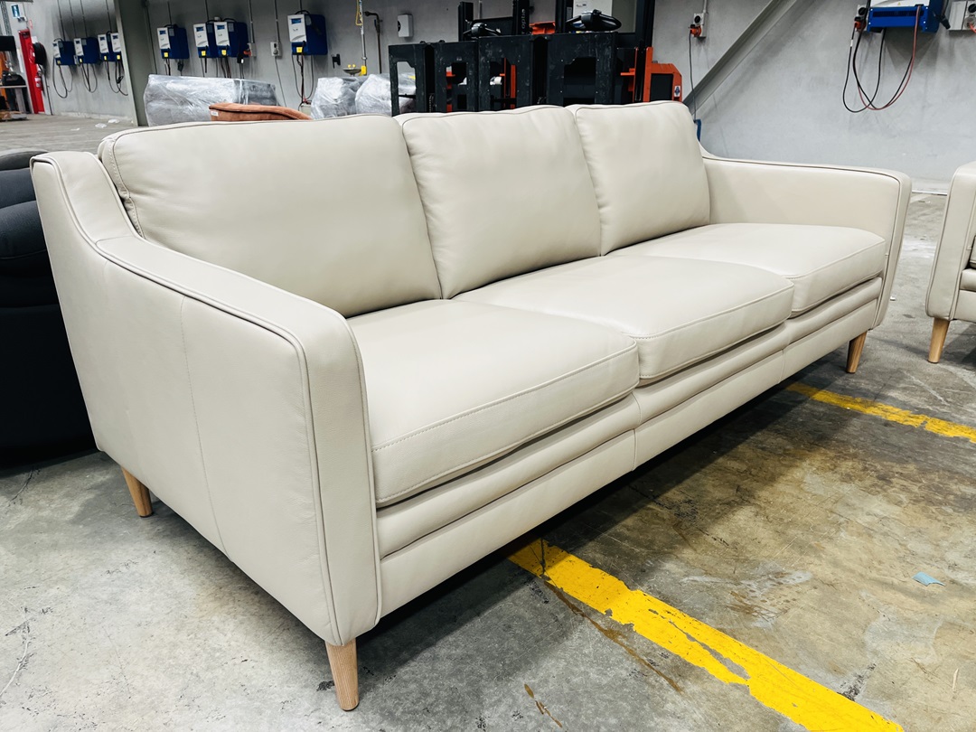 This elegant lounge suite includes a beige leather 2 seater with dual electric recliners and two matching single electric recliners, delivering both comfort and refined style.