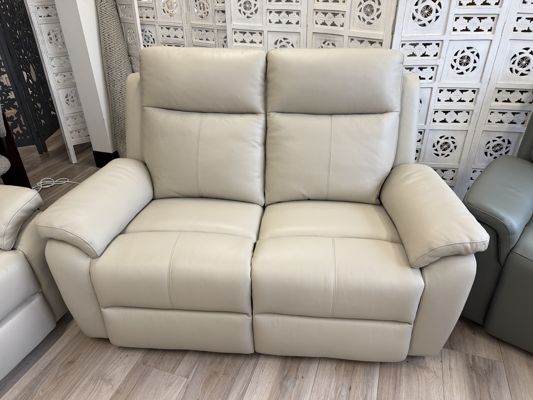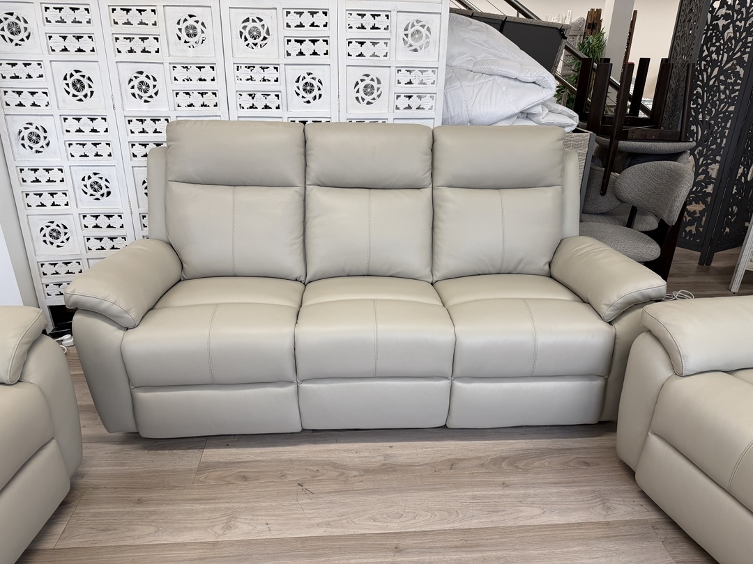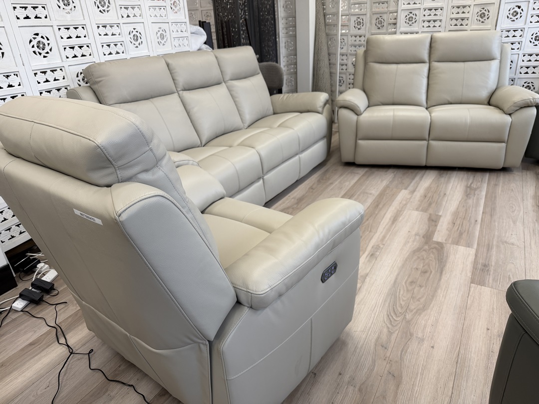 A soft beige leather triple-motor recliner suite offering independent adjustments for full customised comfort, ideal for luxury home seating.