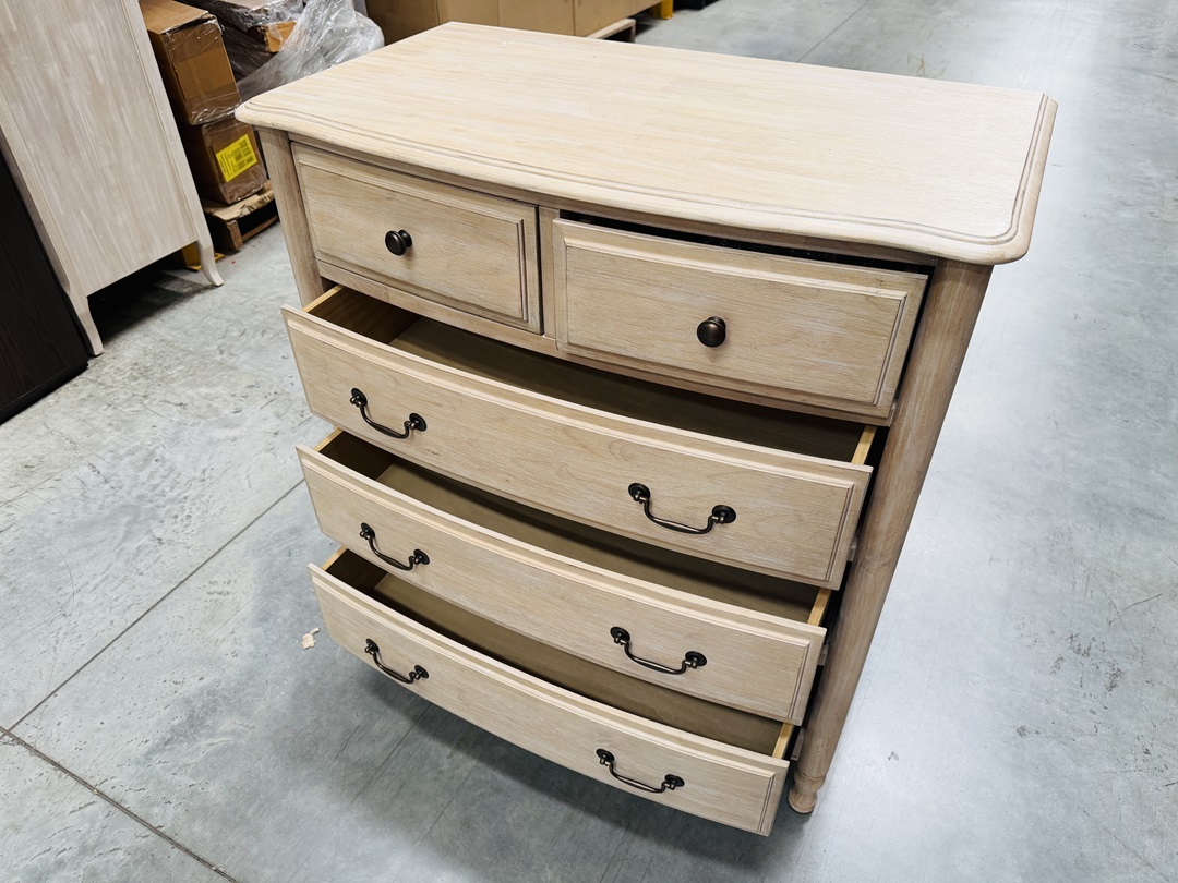 A beautiful tallboy finished in a soft beige wash that features five smooth-gliding drawers and an antique-style design to add timeless charm and practical storage to any bedroom.