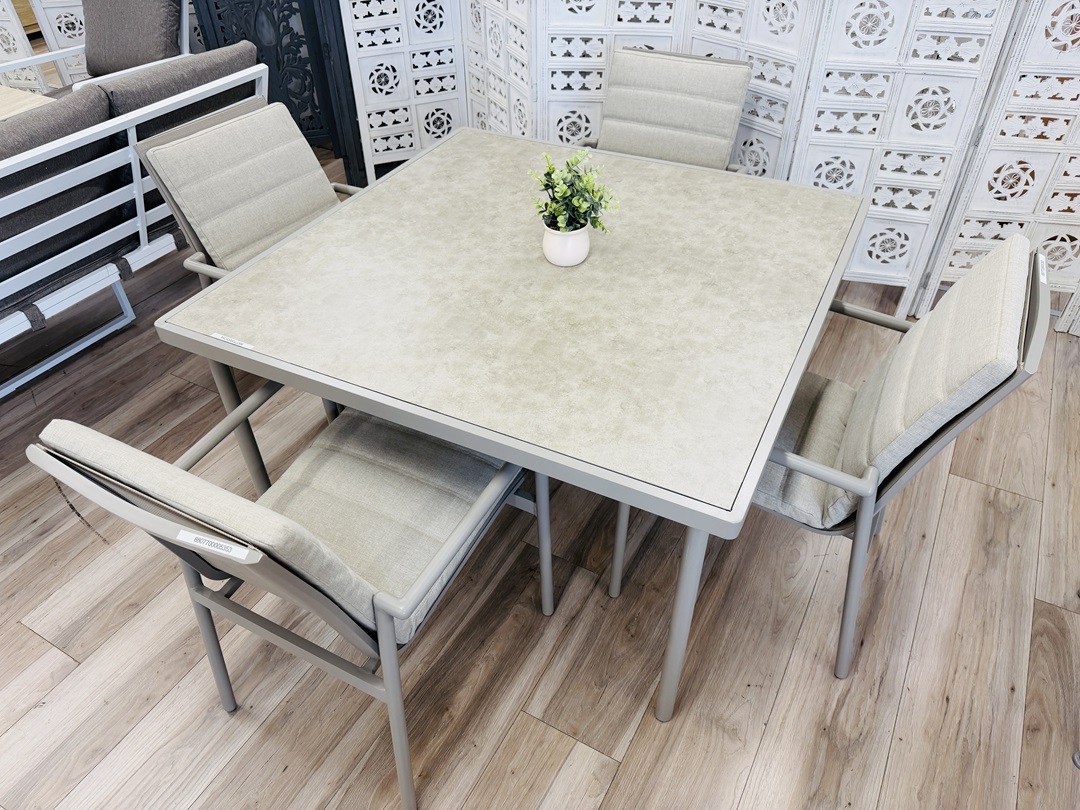 The Beige & White 4pc Outdoor Sofa Set with Reclining Chairs is designed for ultimate outdoor relaxation, featuring adjustable reclining chairs and plush cushions for added comfort. Its light, neutral tones create a fresh and inviting patio setting.