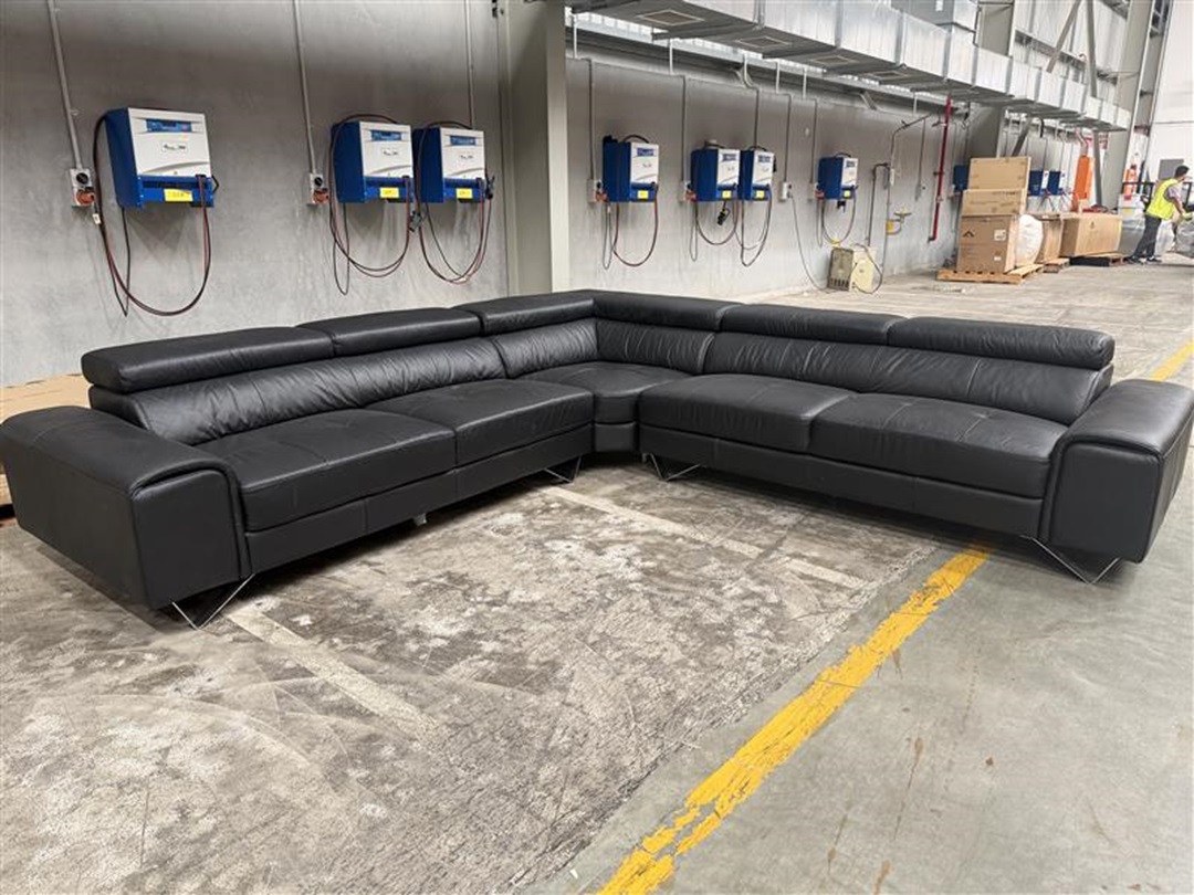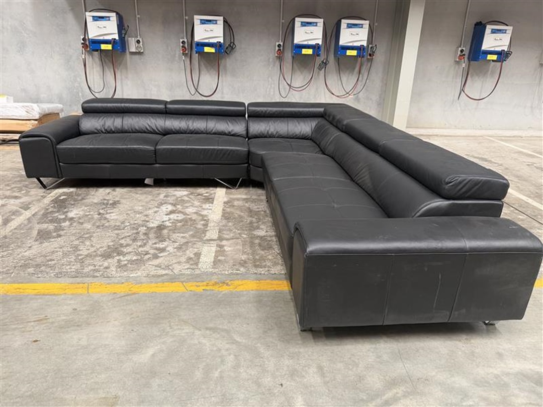 A sleek, modern corner sofa upholstered in premium black leather. Provides generous seating space and a stylish contemporary look suited for modern living rooms.
