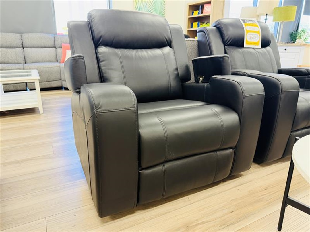 A premium black leather recliner with dual motor operation, smooth electric adjustment, and a built-in USB port for added convenience and comfort.