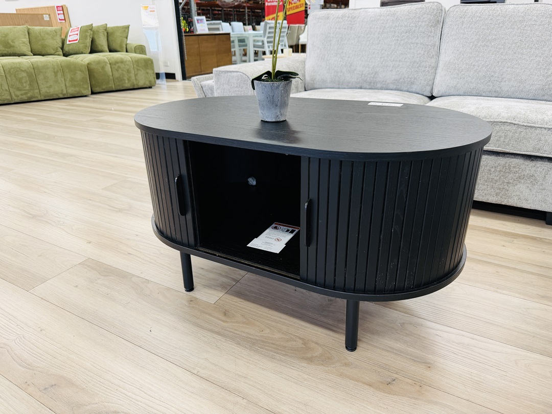 A functional and stylish coffee table crafted in black timber. Featuring sliding doors for concealed storage, it keeps your living space neat while maintaining a clean, modern aesthetic.